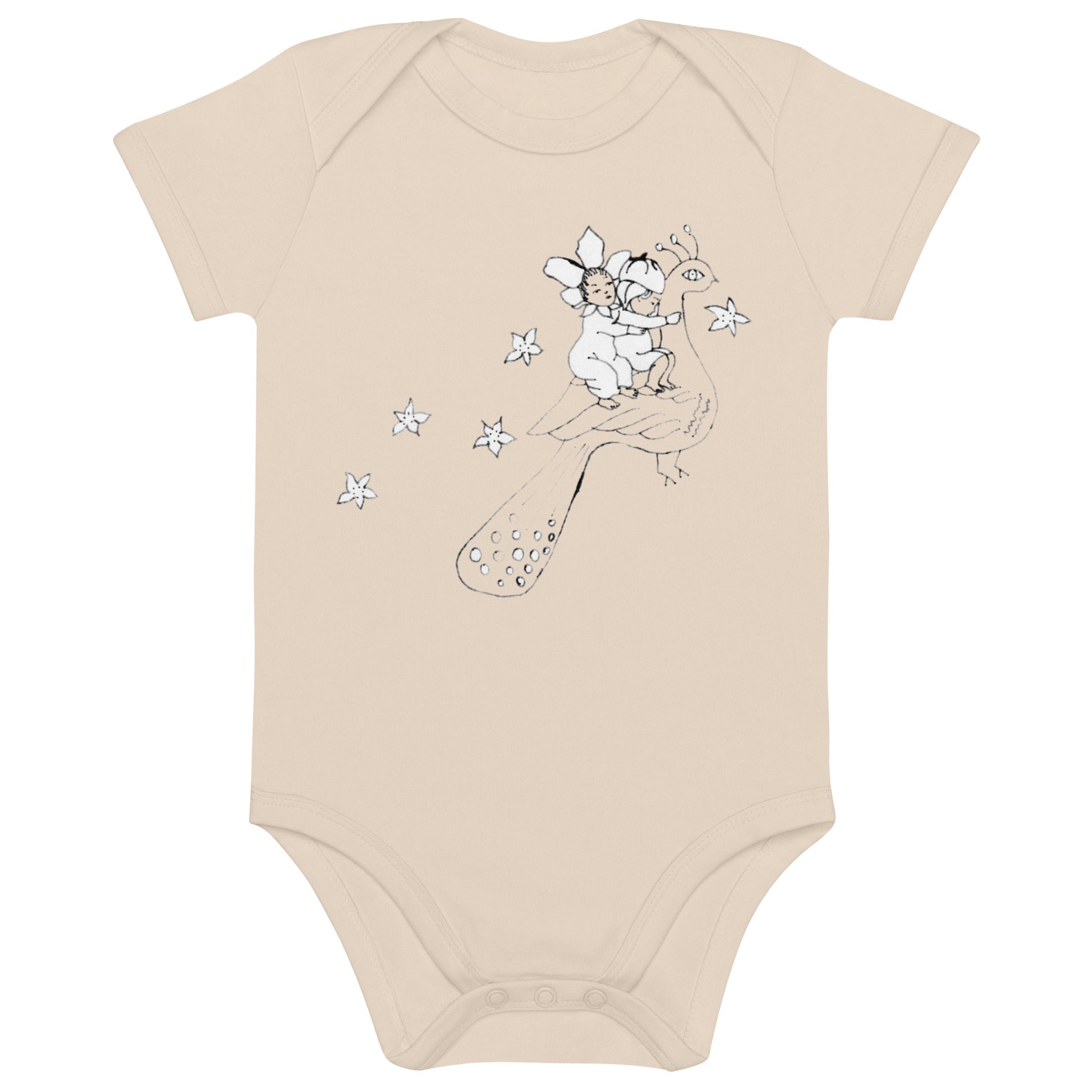 Two Owls Peacock & Friends Organic cotton baby romper. Made from 100% certified organic cotton, this comfy bodysuit will be the right step towards a more sustainable lifestyle. With its extra soft and stretchy fabric and envelope neckline, it’ll be the perfect choice for all active babies.