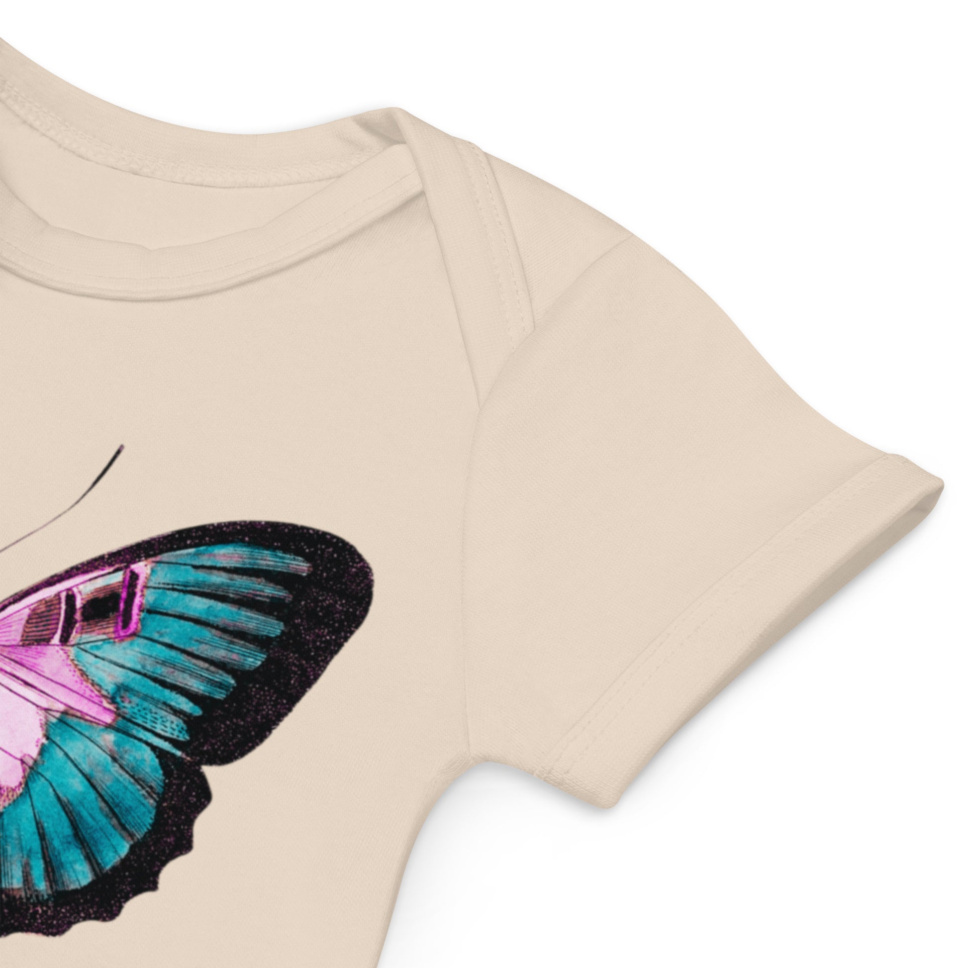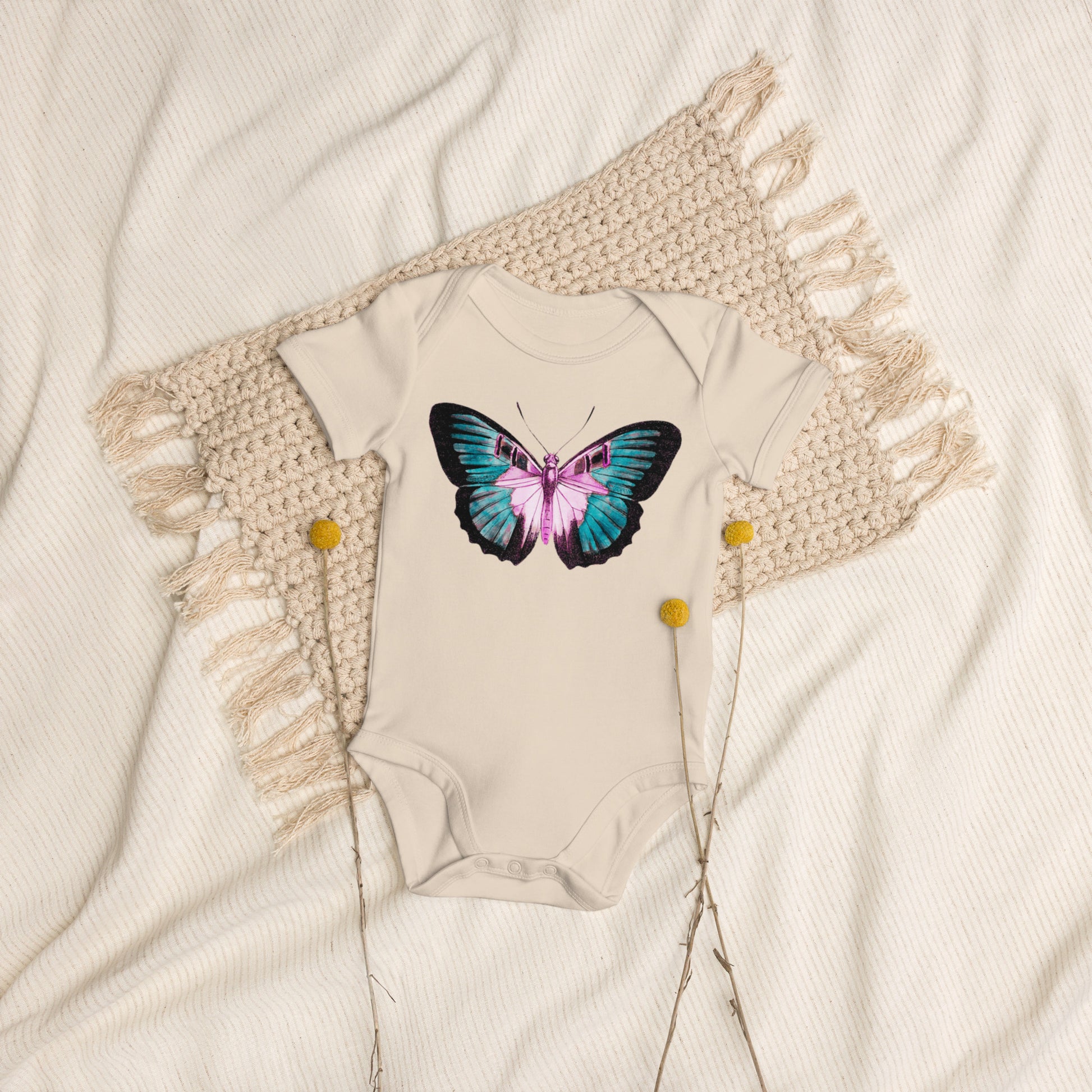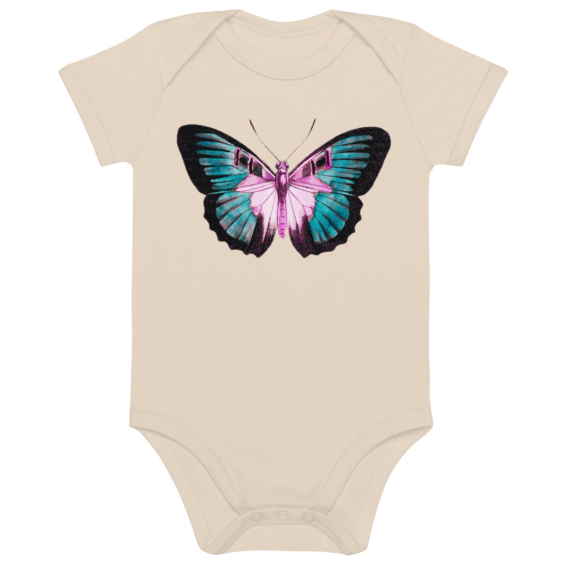 Two Owls Turquoise/Pink Butterfly Organic cotton baby romper. Made from 100% certified organic cotton, this comfy bodysuit will be the right step towards a more sustainable lifestyle. With its extra soft and stretchy fabric and envelope neckline, it’ll be the perfect choice for all active babies.